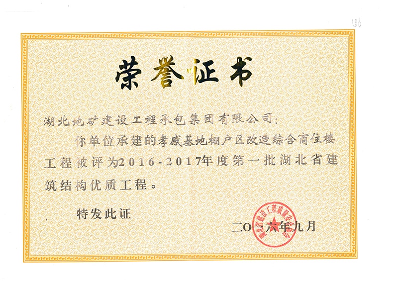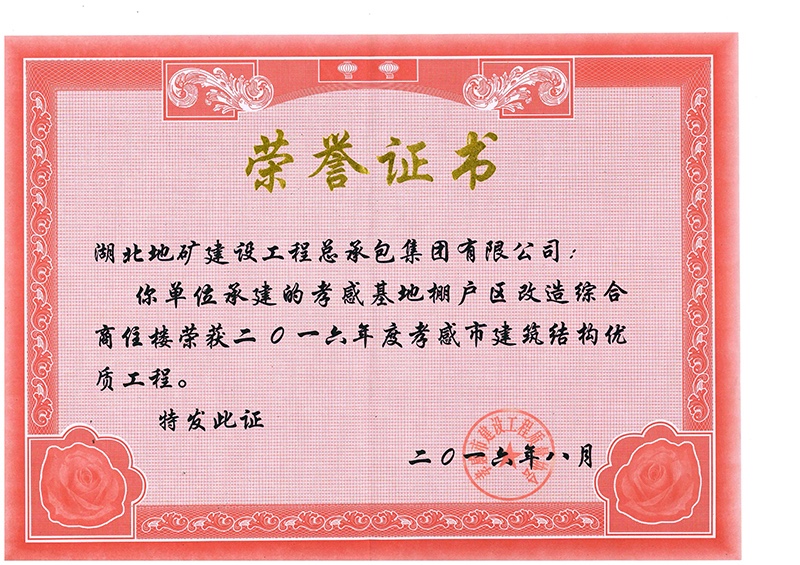 孝感項目獲得孝感市建筑工程優(yōu)質(zhì)結(jié)構(gòu)