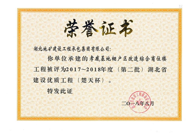 孝感棚戶區(qū)改造項目楚天杯獎狀