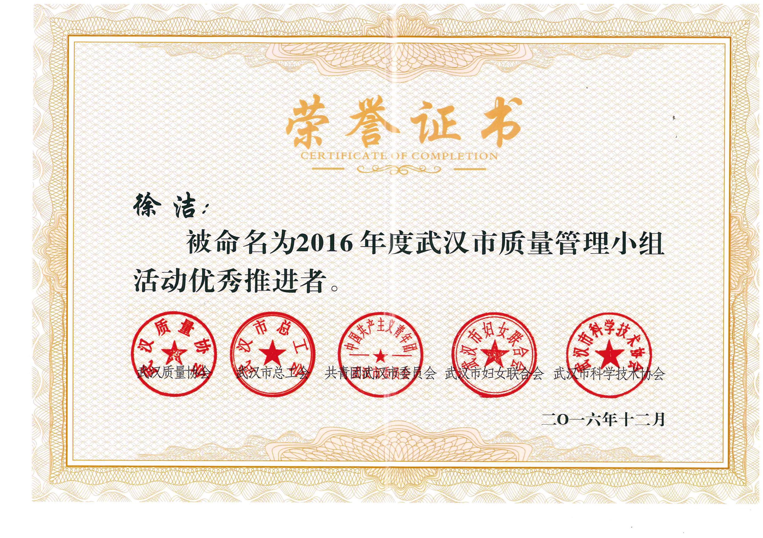 李彥被命名為2016年度武漢市質(zhì)量管理小組活動優(yōu)秀推進者