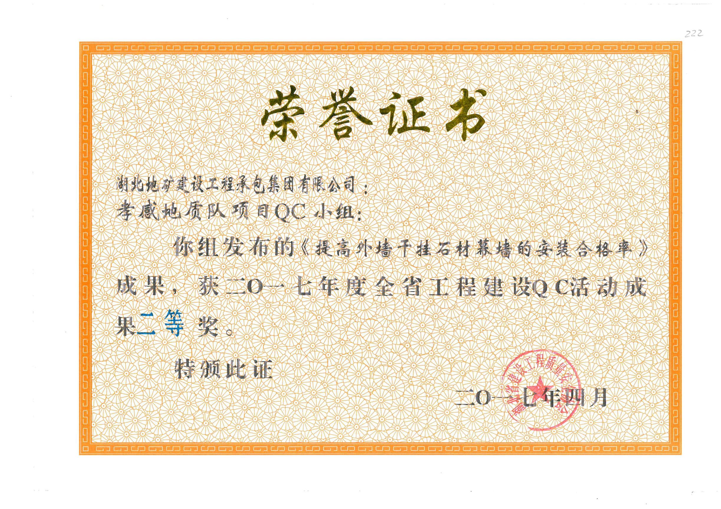 孝感棚改項目《提高外墻干掛石材幕墻的安裝合格率》獲QC成果二等獎