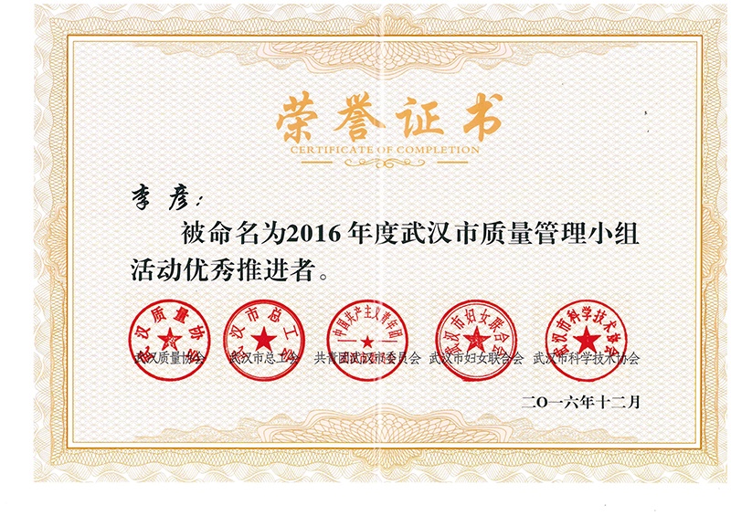 李彥被命名為2016年度武漢市質(zhì)量管理小組活動優(yōu)秀推進者