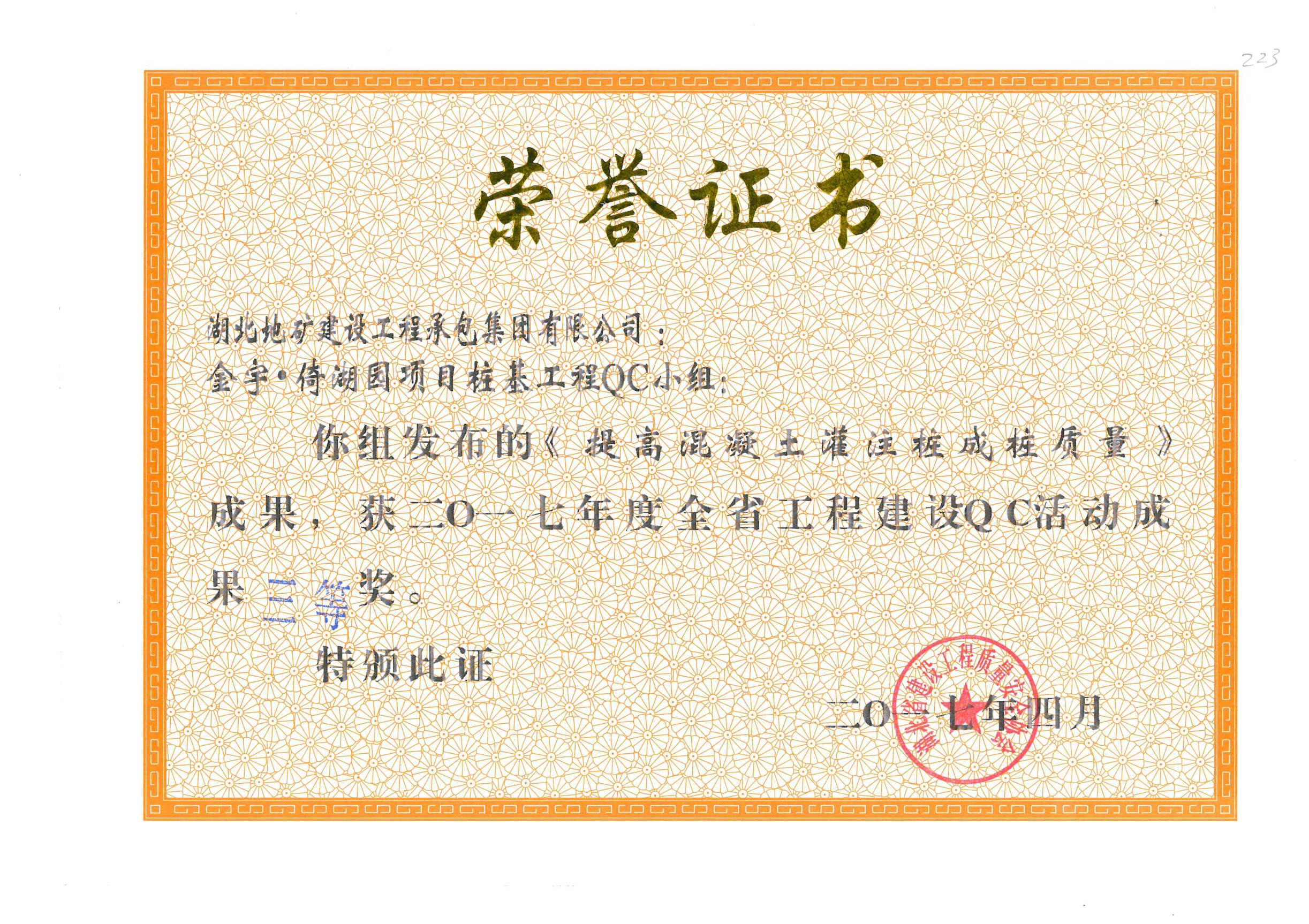 金宇依湖園《提高混凝土灌注樁成樁質(zhì)量》獲得QC成果三等獎