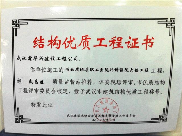 近日,鑫華興公司承建的湖北省地質(zhì)職工醫(yī)院外科住院大樓工程,經(jīng)武昌區(qū)質(zhì)量監(jiān)督站推薦,評(píng)委現(xiàn)場(chǎng)評(píng)審,市優(yōu)質(zhì)結(jié)構(gòu)工程評(píng)審委員會(huì)核定,被授予“武漢市建筑結(jié)構(gòu)優(yōu)質(zhì)工程”稱(chēng)號(hào)。