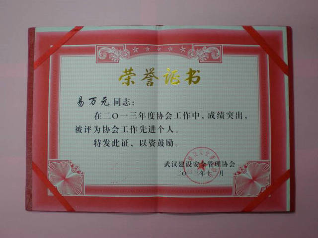 2013年12月31日,在2013年度武漢建設(shè)安全管理協(xié)會(huì)年會(huì)上,地建承包公司和武基公司雙雙榮獲2013年度協(xié)會(huì)工作先進(jìn)單位榮譽(yù)稱號(hào),同時(shí),承包公司總經(jīng)理程立文和武基公司總經(jīng)理易萬元也分別榮獲2013年度協(xié)會(huì)工作先進(jìn)個(gè)人榮譽(yù)稱號(hào)。