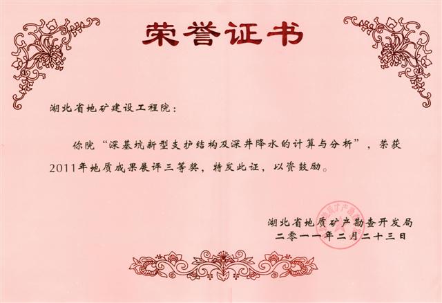 全局34項(xiàng)地質(zhì)成果參加了地質(zhì)成果展評(píng), 29項(xiàng)成果參加評(píng)選,(包括工程院選送的“湖北省工程建設(shè)工法的開發(fā)”成果在內(nèi)的5項(xiàng)成果因近兩年在省局或省廳獲過獎(jiǎng)而不參加本次評(píng)獎(jiǎng)),共評(píng)出壹等獎(jiǎng)2項(xiàng),貳等獎(jiǎng)4項(xiàng),叁等獎(jiǎng)8項(xiàng)。由工程院選送的“新型基礎(chǔ)工程施工工藝研究”成果榮獲貳等獎(jiǎng),“深基坑新型支護(hù)結(jié)構(gòu)及深井降水的計(jì)算與分析” 成果榮獲叁等獎(jiǎng)。