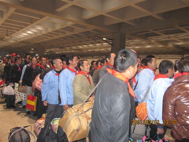 3月1日23時20分,第二批湖北地建集團駐利比亞項目工程人員共106名,乘坐北京-武漢的D121次列車安全抵達(dá)武漢,地建集團總經(jīng)理程立文、黨委書記吳國才等到車站迎接。按撤離預(yù)案,撤離回國的人員的先后順序為女同志、勞務(wù)人員、管理人員,項目部管理骨干和黨員最后撤離,這次撤離的主要是勞務(wù)人員。
