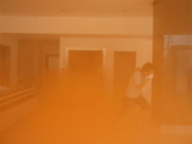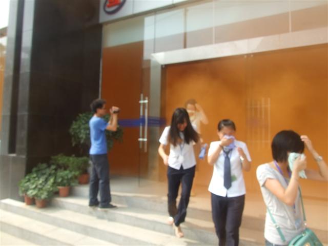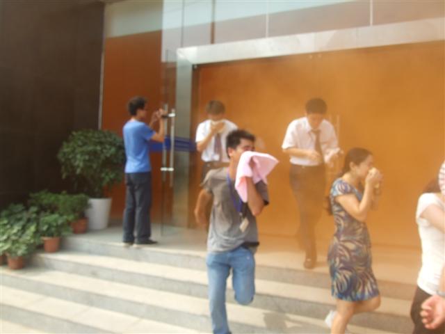 15時30分,演練活動正式開始,地建大樓二樓和六樓發(fā)生“火災(zāi)”,頃刻間濃煙滾滾,火勢迅速蔓延,有形成立體燃燒之勢。演練總指揮程立文同志在聽取了警報組人員匯報的火情后,立即宣布啟動地建大樓消防疏散逃生應(yīng)急預(yù)案。霎時,警笛大作,相互提醒聲、疏散指導(dǎo)聲不斷。救援人員抬著“傷員”、攙扶弱者忙而有序;逃生人員濕巾掩鼻、低頭彎腰、手摸通道墻壁順勢而下,慌而不亂。不到10分鐘,所有人員安全撤到集合地點(diǎn)。