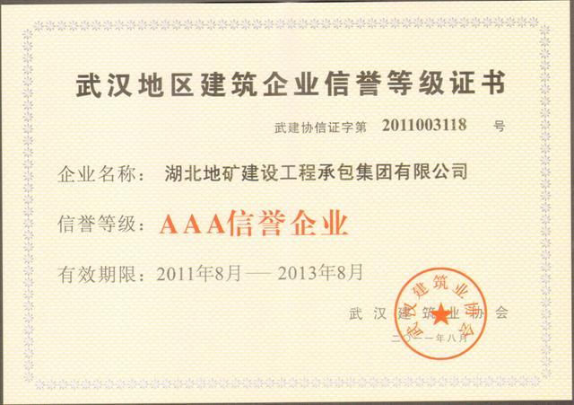 2011年8月26日,武漢建筑業(yè)協(xié)會公布了2011年武漢地區(qū)建筑業(yè)企業(yè)信譽等級評定結(jié)果,湖北地礦建設(shè)工程承包集團(tuán)有限公司再次被評為“武漢地區(qū)建筑業(yè)AAA級信譽企業(yè)”。