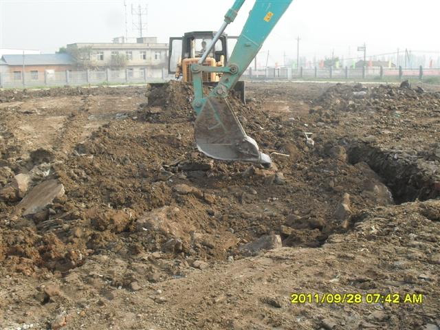 噸重的旋挖鉆機要在場地行走,對場地內(nèi)多處軟弱易陷的地方進(jìn)行了硬渣換填,并用壓路機壓實。據(jù)了解,整個場地還準(zhǔn)備攤鋪