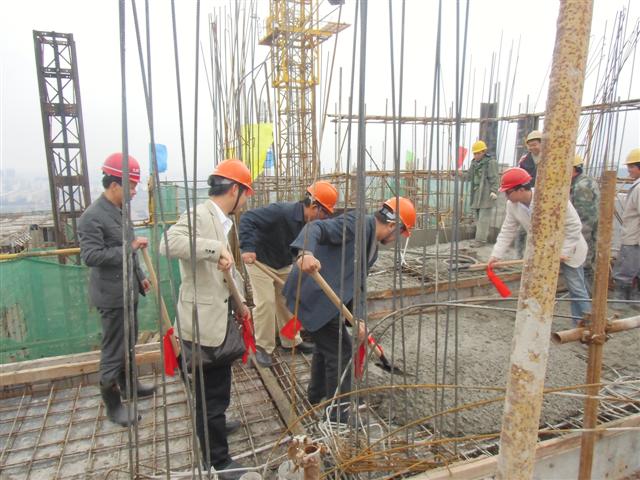 封頂儀式上,湖北地建集團(tuán)董事長(zhǎng)兼總經(jīng)理程立文、副總經(jīng)理李彥,武漢外經(jīng)房地產(chǎn)公司董事長(zhǎng)黃必健、總經(jīng)理黃箏,九州監(jiān)理公司負(fù)責(zé)人及項(xiàng)目部管理人員共同為12#樓主體結(jié)構(gòu)澆筑最后一塊混凝土。 鼎盛華城一期11#12#13#樓主體結(jié)構(gòu)自2011年6月中旬開(kāi)始施工以來(lái),項(xiàng)目部管理人員和各班組齊心協(xié)力、克服重重困難,消除各種不利影響因素,抗暴雨、戰(zhàn)酷暑、經(jīng)過(guò)短短5個(gè)月的時(shí)間保質(zhì)保量按時(shí)實(shí)現(xiàn)了主體結(jié)構(gòu)封頂。主體結(jié)構(gòu)封頂以后,鼎盛華城一期11#12#13#樓工程進(jìn)入裝修階段。項(xiàng)目部管理人員表示,將再接再厲完成后期施工任務(wù),爭(zhēng)創(chuàng)建筑結(jié)構(gòu)優(yōu)質(zhì)工程“楚天杯”。
