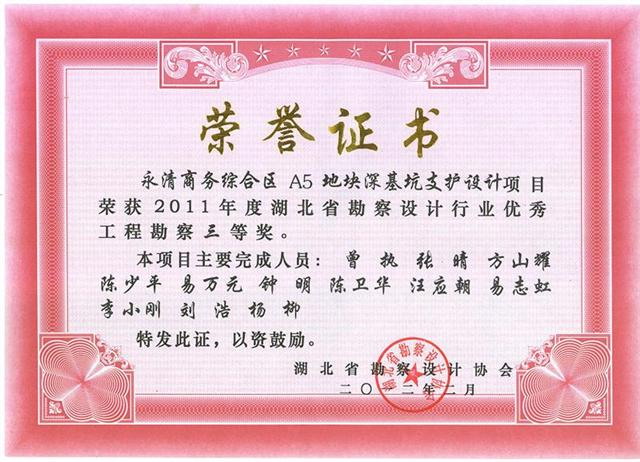 近日獲悉,由武基公司承接的永清商務(wù)綜合區(qū)A5地塊深基坑支護設(shè)計項目被湖北省勘察設(shè)計協(xié)會評為2011年度湖北省勘察設(shè)計行業(yè)優(yōu)秀工程勘察三等獎。