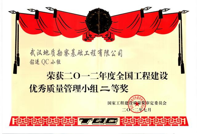 7月2日至7月6日,在中國(guó)施工業(yè)協(xié)會(huì)工程建設(shè)質(zhì)量管理協(xié)會(huì)舉辦的2012年全國(guó)工程建設(shè)質(zhì)量管理小組代表會(huì)議上,武基公司鉆進(jìn)QC小組“提高旋挖鉆機(jī)嵌巖施工效率”參加了本次大會(huì)成果發(fā)布,經(jīng)大會(huì)評(píng)審組專家評(píng)審,國(guó)家工程建設(shè)質(zhì)量獎(jiǎng)審定委員會(huì)審定,該QC小組榮獲全國(guó)工程建設(shè)優(yōu)秀質(zhì)量管理小組二等獎(jiǎng)。