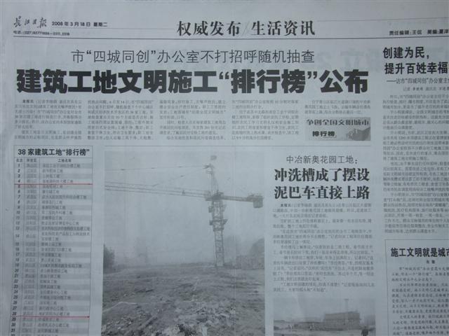 2008年3月18日,《長江日報》第5版刊登了武漢市“四城同創(chuàng)”辦公室(即創(chuàng)建全國文明城市、國家衛(wèi)生城市、國家環(huán)保模范城市和國家園林城市辦公室)組織開展的隨機抽查評比建筑工地文明施工活動的結(jié)果,我公司承接的“地調(diào)科技大樓項目”在活動中脫穎而出,排名全市第四;“職工醫(yī)院項目”也榜上有名。
