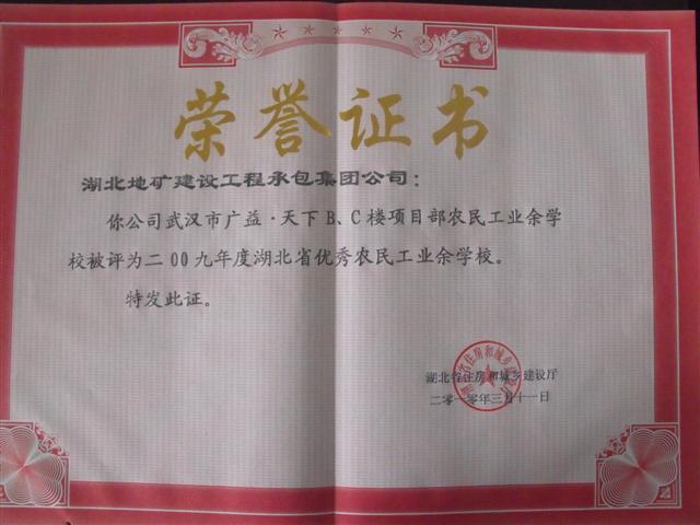 2010年3月11日,湖北地建承包公司廣益·天下B、C棟項(xiàng)目部榮獲2009年度湖北省優(yōu)秀農(nóng)民工業(yè)余學(xué)校榮譽(yù)稱號(hào),湖北省住房和城鄉(xiāng)建設(shè)廳頒發(fā)榮譽(yù)證書。